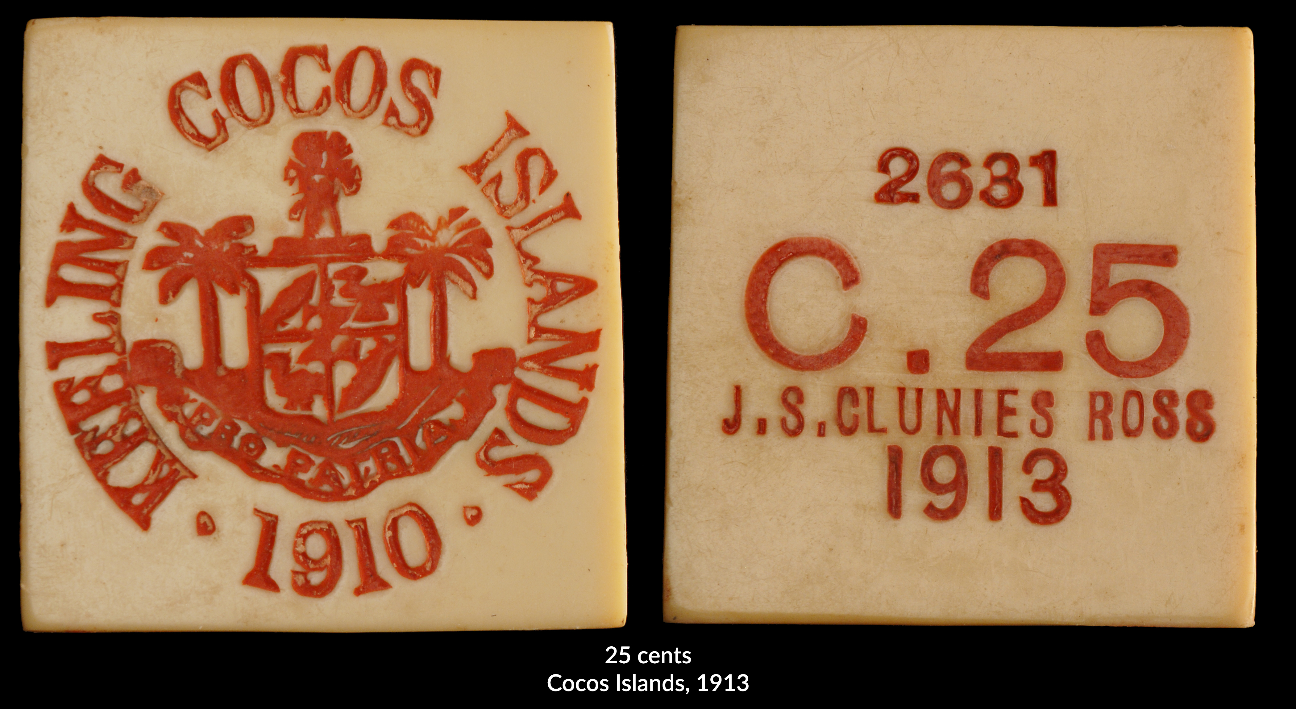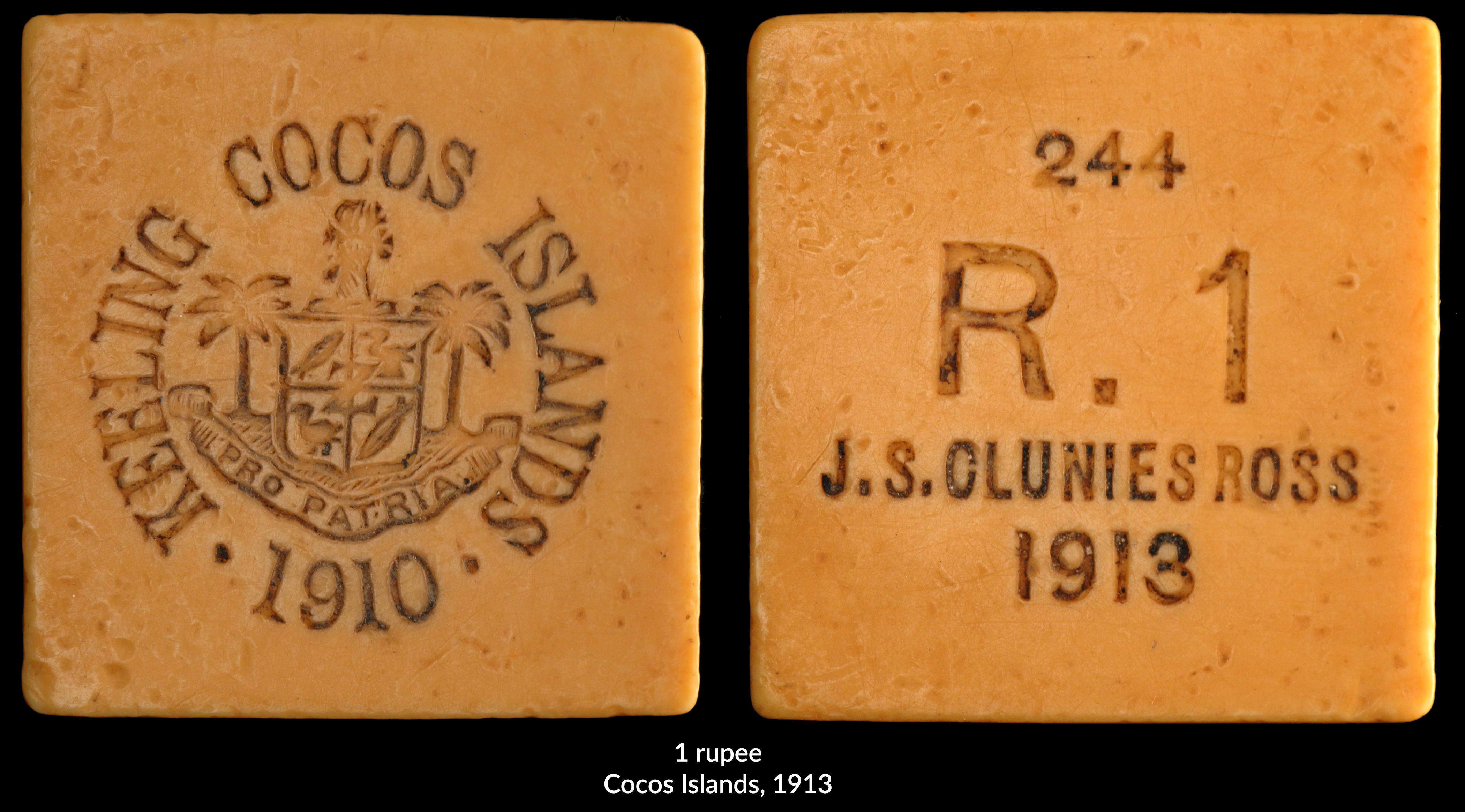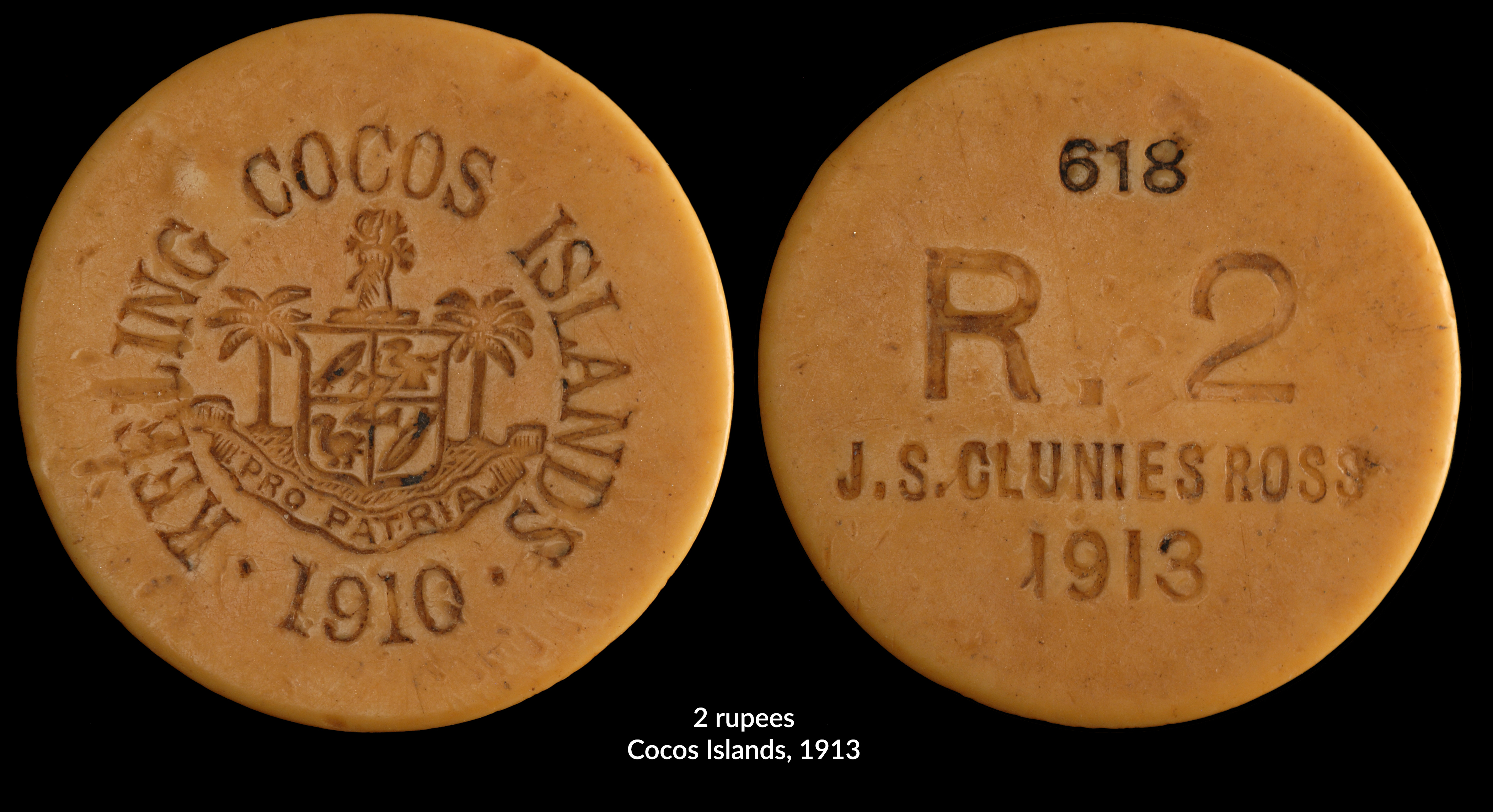 The tokens were a variety of shapes including circles, ovals, squares and octagons. These unusual shapes and material served a purpose: Ross IV followed in his great-grandfather’s footsteps to create a closed economic system which prevented the islanders who worked at his plantation and store from buying firearms, alcohol or other goods from passing ships. The tokens continued in circulation until 1955, when the Cocos Islands became an Australian territory.
