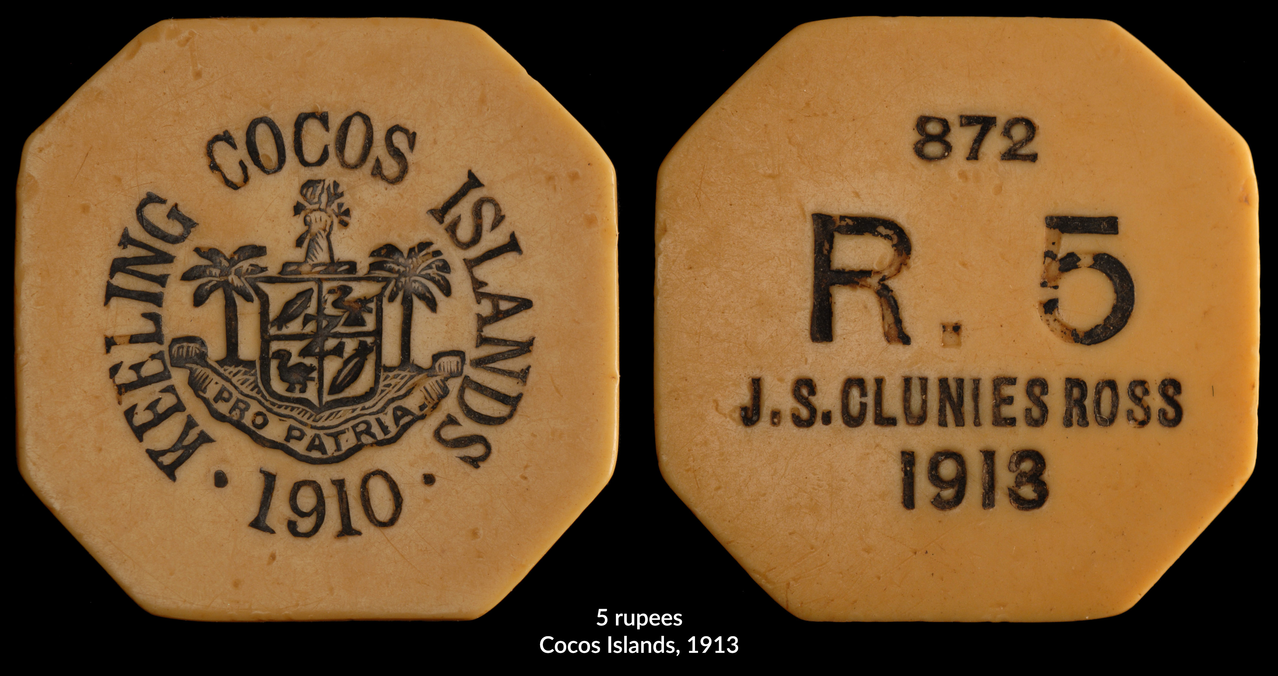 Each denomination’s obverse features the arms of the island with KEELING COCOS ISLANDS around, PRO PATRIA (for the fatherland) below and 1910 – the year Ross IV gained power. Each reverse includes the denomination, a serial number, the authorizing inscription J. S. CLUNIES ROSS, and 1913 – the year of issue.